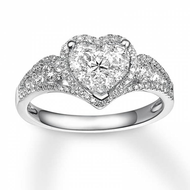 A bouquet of round diamonds forms a heart shape in this romantic ring for her. Diamonds align on either side to add a brilliance of their own, while smaller diamonds trace the heart and line the band of 14K white gold to complete the look. This enchanting ring has a total diamond weight of 3/4 carat.
